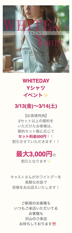 今日、明日はホワイトデーイベント WHITEDAYYシャツイベント✨ 3/13(金)~3/14(土)【お客様特典】2セット以上の確約をいただけたお客様は、確約セット数に応じてセット料金500円!!割引させていただきます!!最大3,000円の割引となります✨キャストさんがホワイトデーを素敵な衣装で皆様をお出迎えいたします! 素敵?な衣装かどうかは分からんけど(*´艸`) 明日出勤です お時間都合合う方お待ちしてます (;´・ω・)/Help me