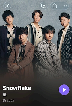 光さんに入店した 初日から。。。 気になる音楽が流れてまして。。。(*´・д・)*´。_。)ゥミュ (⚆ ̫⚆👂")耳ピクピク あれ•́ω•̀)? この曲ってか、 この声って。。。。 (*ÒωÓ*)ムムッ!! どう考えても 嵐っぽい。。。 しかし。。。 あれれ(。• . •。) ?? あまり聞かないというか テレビでも観てない曲だ😭 ぁぁぁ。(´°̥ω°̥`) そして少し時間が出来たので。。。 曲検索アプリ起動 ฅ:(´◦ω◦`ฅ):カタカタ 検索中(((( '-' ))))カタカタ 出ました!! Snowflake って曲名🤔 •́ω•̀)?ハニャ さらに調べました(*´・∀・)*´-∀-)ウン 2007年初回限定盤のカップリングとの事💧 確か。。。その時期は 洋楽にガチハマリし始めた頃で(レディーガガにドハマリしてマネしてた( *´艸`)) 妹に「お願いだから1回VS嵐観て~」 と言われても 頑なに拒否をしていた頃を 思い出しました( ・д・ ポカーン… その翌年から妹に洗脳され嵐にハマった気がします ∠( ˙-˙ )/ピン 知らない曲を知れて 自分にとっては 新曲✨️って感じで嬉しいです ワーイ\(* ॑꒳ ॑* \三/ * ॑꒳ ॑*)/ワーイ てなわけで妹にSnowflake覚えてる?って聞くつもりです(๑•̀ㅁ•́ฅ✨ あと、嵐のラストシングル買うかどうかも聞いてみます(*-ω-)ウンウン