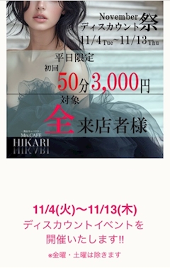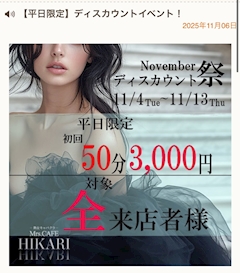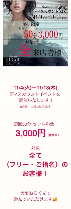 こんばんは🌙 本日21時からいます🫡 そういえば今光はお得なイベントやってます💡 誰でも最初のワンセット3,000円てお得ですよね😊 来週の木曜日まで!是非お待ちしてます🥰