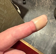 先日朝方 切りました キャベツを でかいキャベツを 千切りにしてやろうと 振りかぶり 第一刀目で 人差し指をざっくり やってしまいました 血が出て 血が出て 痛いながらも 千切りは達成しました (´・Д・)」