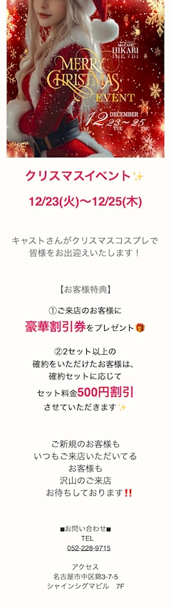 こんばんは🌙 ゆう21時半からです🫡 今日からクリスマスイベント🎄 みんなサンタさんかトナカイちゃんの衣装でお待ちしてます🥰 お得な割引もあるので是非✨