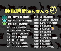 こんばんは あきなです♪ 皆様ちゃんと睡眠時間 確保出来ていますか? いきなりですが 睡眠時間ランキング~👏 ジャジャンッ 🐰🐱🙈🐑 圧倒的1位に輝いたのは〜 ドゥルルルル バンッ! コアラ🐨 22時間!!! リス14.9時間も びっくりしたけど キリンの睡眠時間 1.9時間!!! 心配ないさぁ〜🦒🦒🦒💨 あきなの睡眠時間は 🐐ヤギ(5.3h)とウシ(3.9)の間🐮 を いったりきたり かと思えば チンパンジー(9.7h)くらい 寝てたり🐒 日々毎日同じリズムで 眠りたい😴 ☆.*゚•*¨*•.¸♡o。+ ☆.*゚•*¨*•.¸♡o。 あきな