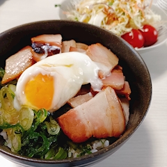 温玉戦争終結へ きらりです・:*+.(( °ω° ))/.:+ 皆さまご機嫌よう🥀 今日のお昼はおうちの残りもので チャーシュー丼🐷 温泉卵ですがこないだの ゆで卵作る機械(?)では 結局 80点ラインのものしか出来ず🥚 しかし先日Tさんと レンジで温玉って出来たよね? って話をしたので 初めてやってみました🙌 本当は600Wで1分なんですが 我が家のレンジは なぜか600Wがないので (500Wと650Wがある) (なんでやねん) 500Wで1分20秒やったら 少し固かったです🥲 次回に期待! で、食べすぎて苦しいので 横になっております… (牛になるね🐮) それでは皆さま また後ほど(・ω・)ノシ