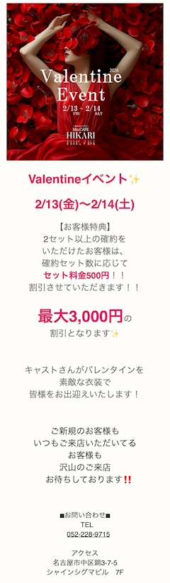 こんばんは🌙 本日おやすみ頂いています🍀*゜ 明日からまたよろしくお願いします(o・・o)/~ ついにバレンタインイベント🎪 変な格好してるのでぜひ見て笑ってくださいな(笑) 予定も未定な部分多くどうなるか分かりませんが、来てくださった方に楽しんでもらえるようにこにこ笑顔でがんばります😚❤️🍫